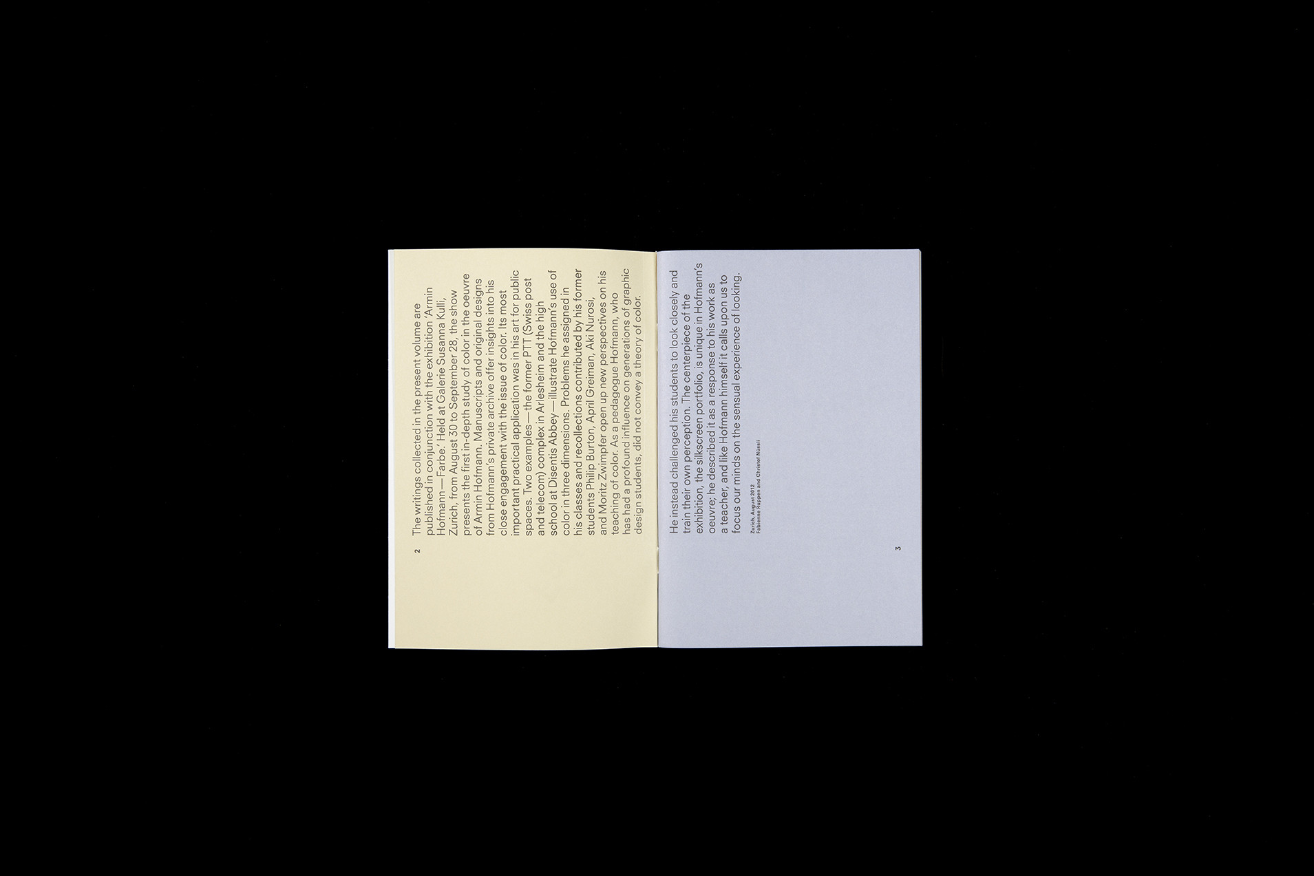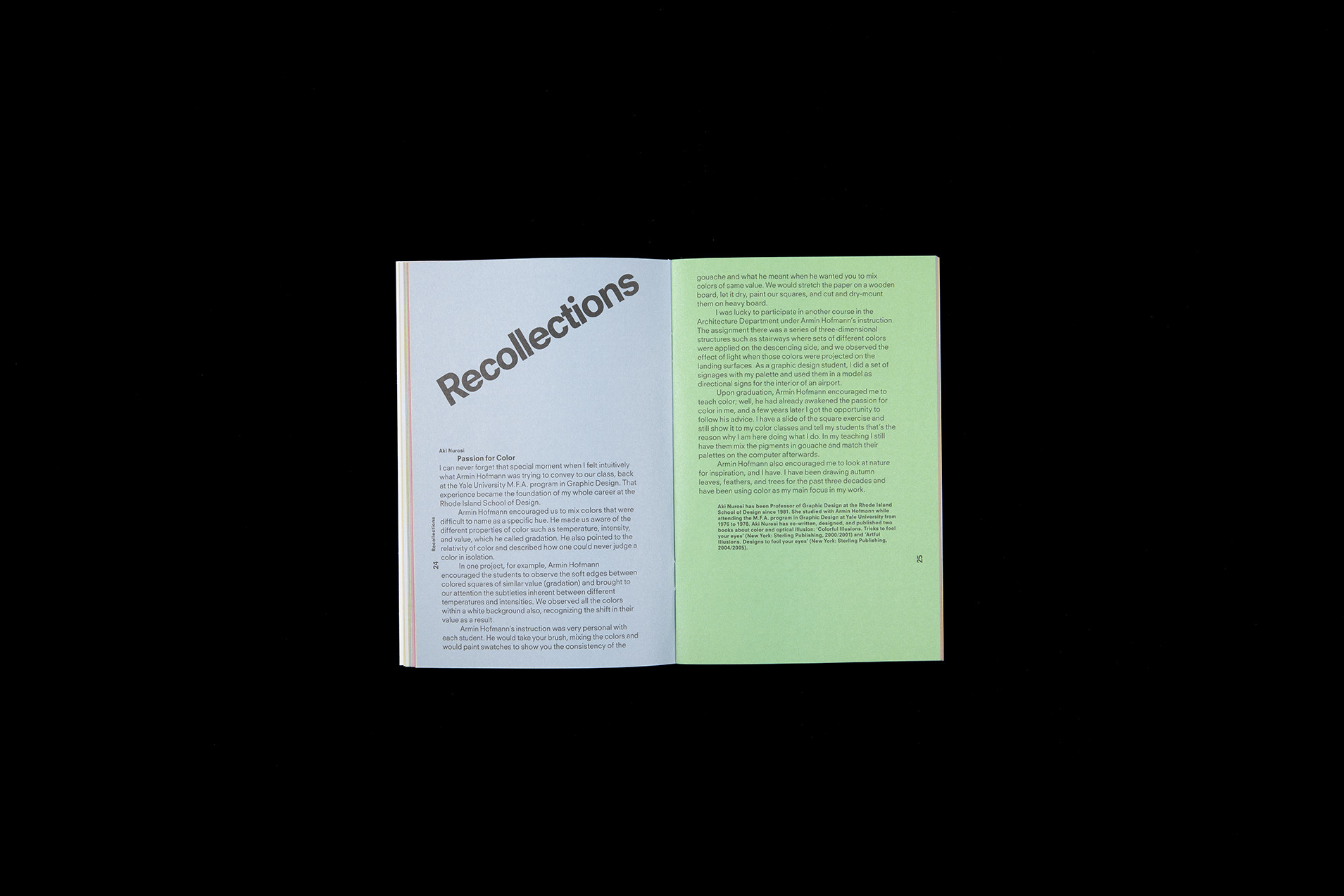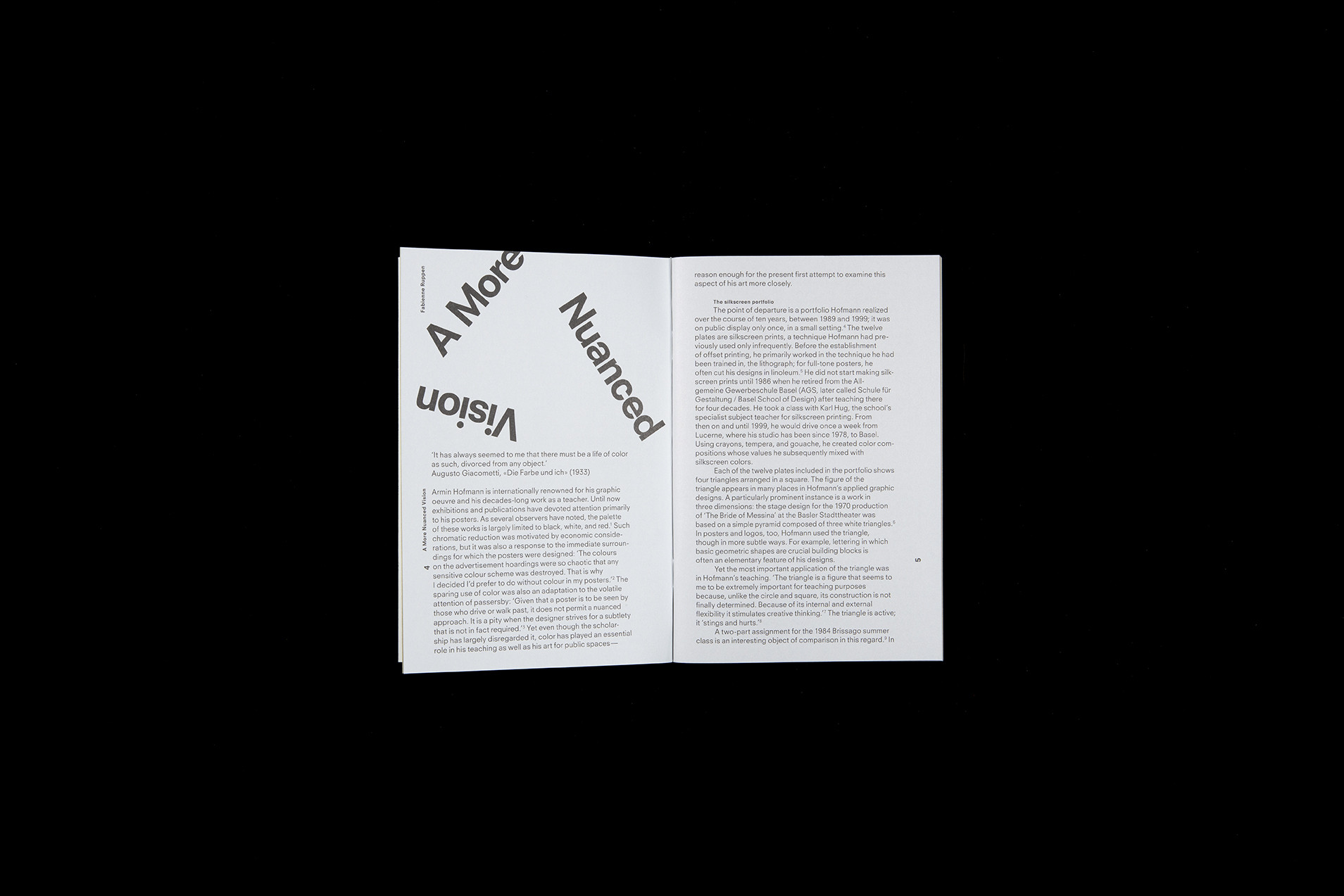 The publication Armin Hofmann—Farbe. Texts on the exhibition was published on the occasion of the exhibition at Gallery Susanna Kulli, Zurich, in the summer of 2012, providing background information about the color work of the Swiss graphic designer. The bilingual publication includes the essays A More Nuanced Vision (Fabienne Ruppen) and Studies in Space (Fabienne Ruppen, Christof Nüssli) as well as recollections written by Armin Hofmann’s former students Philip Burton, April Greiman, Aki Nurosi and Moritz Zwimpfer. These accounts open up new perspectives on his teaching of color.