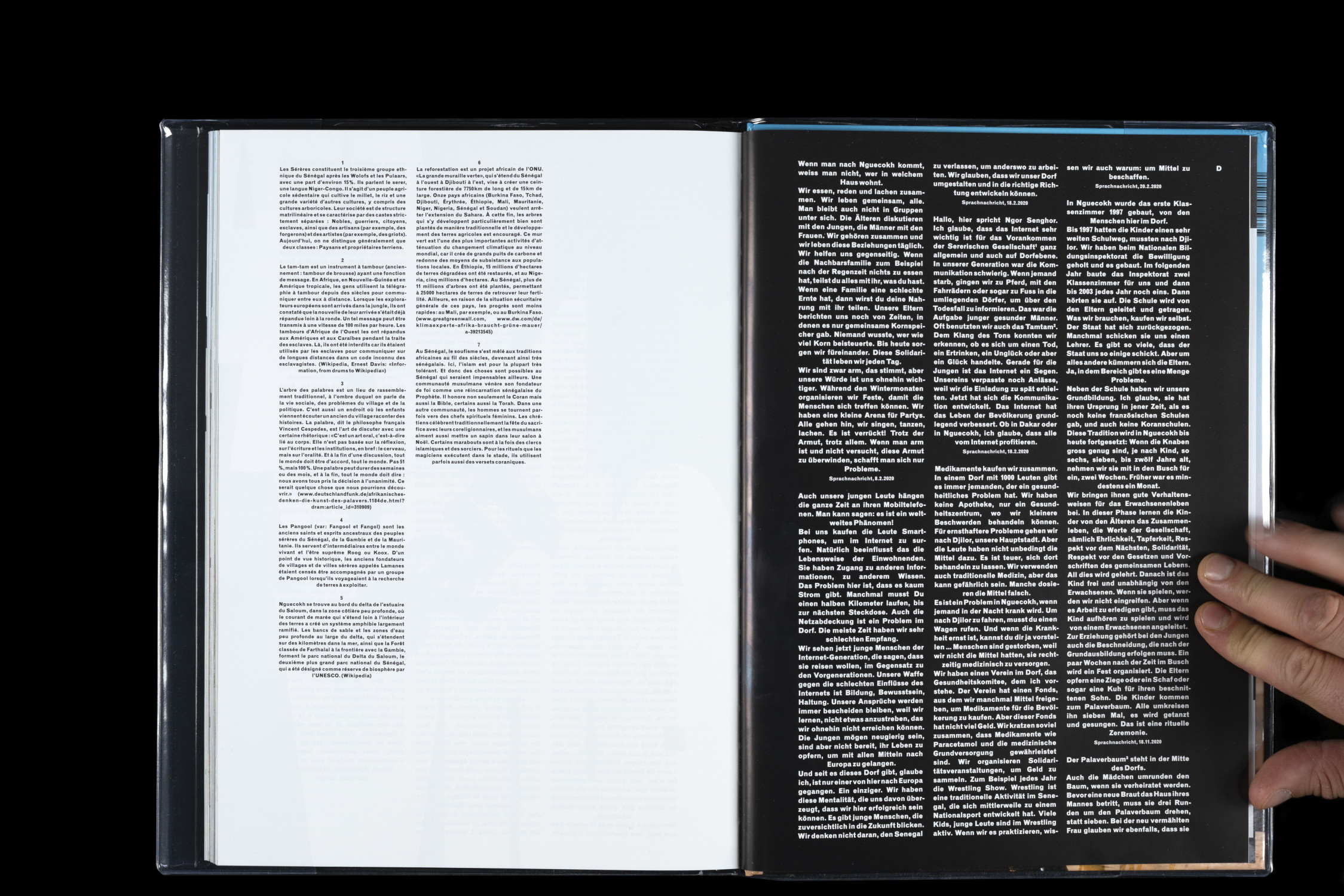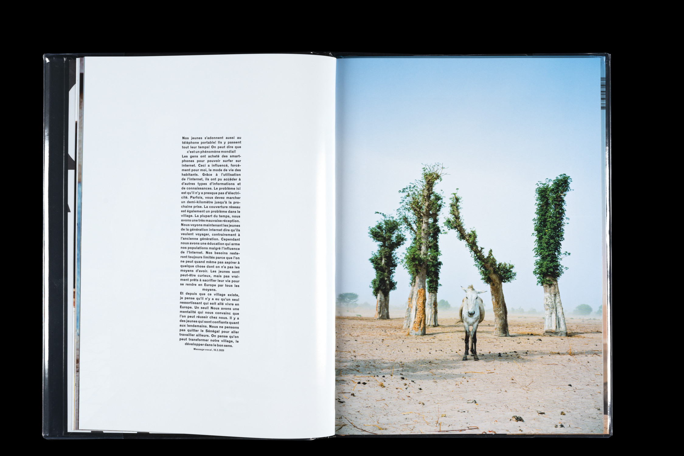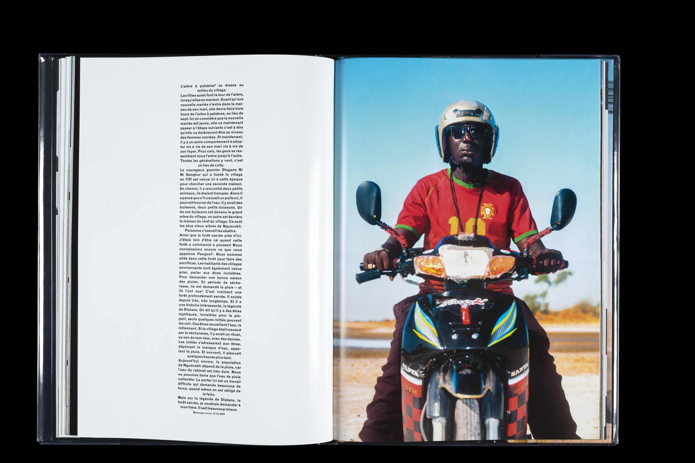 Photographer Tom Huber travels to the small Senegalese village of Nguecokh, in the Saloum River Delta about 200 kilometres south of Dakar. He meets the people, who mainly farm peanuts and melons and lead a self-sustained, communal life. Immediately upon his arrival, the village children want to be photographed, and soon the adults too. Unexpectedly, a project begins to develop – a photobook that aims to strike a balance between documentary photography and art, accompanied by a text in which the locals describe the history of the village and their everyday lives. In the months following, the artist exchanges voice messages with his host Mamadou Senghor, the village teacher. They discuss climate change, polygamy, and religion. He describes the challenges in their education and health systems, recounts old folktales of trees and woods, and charts Nguecokh’s path toward the future.