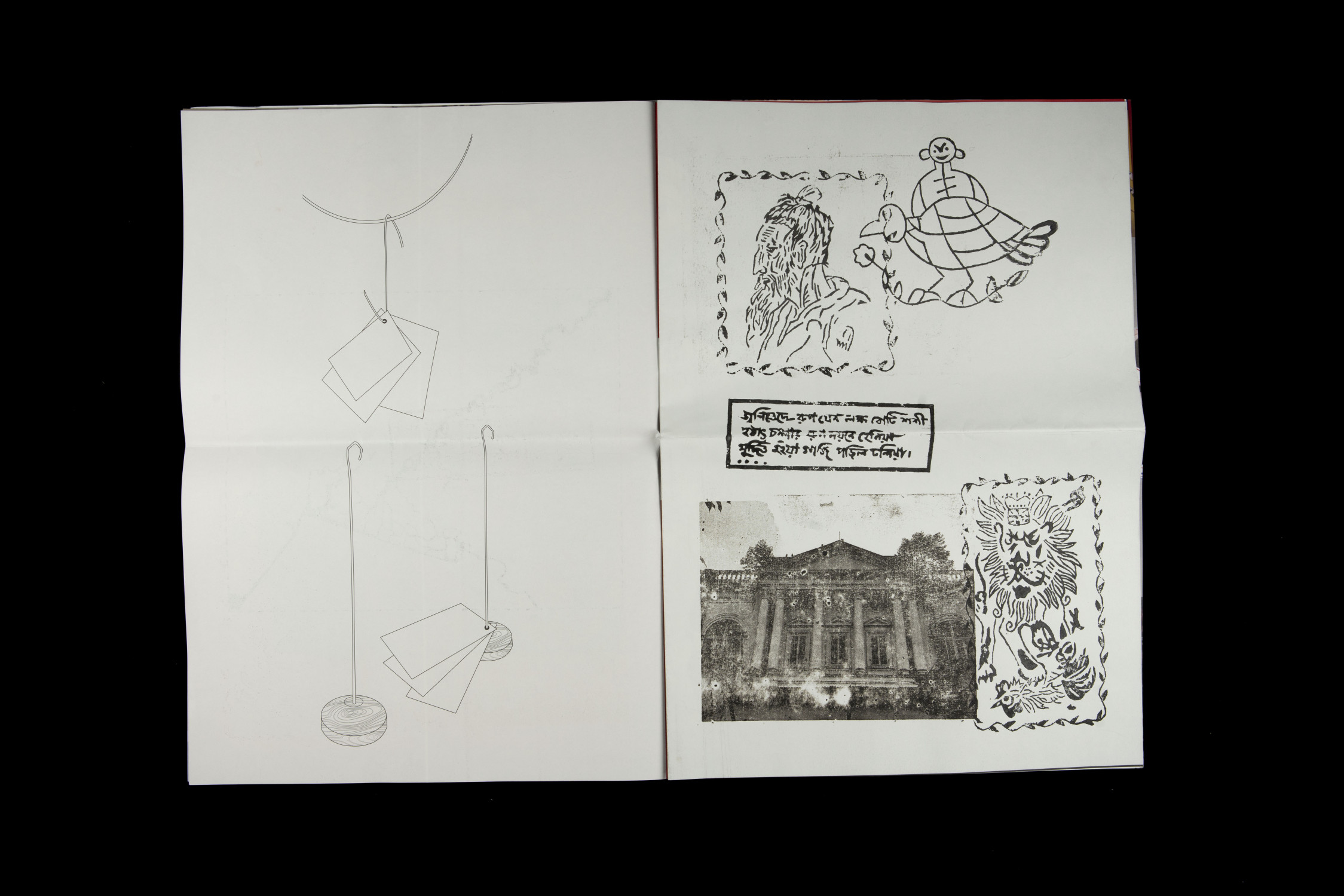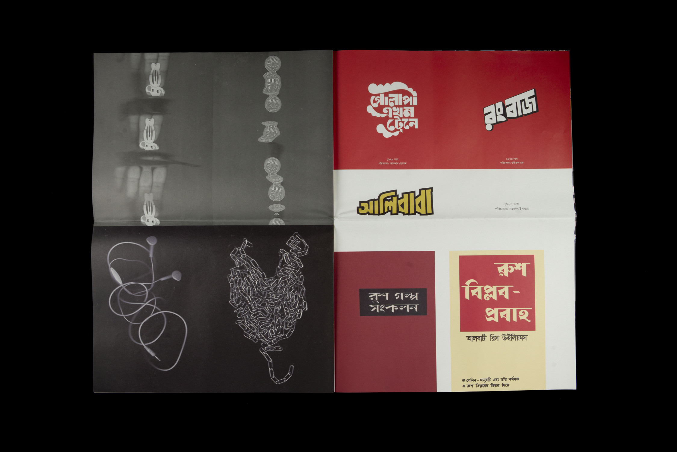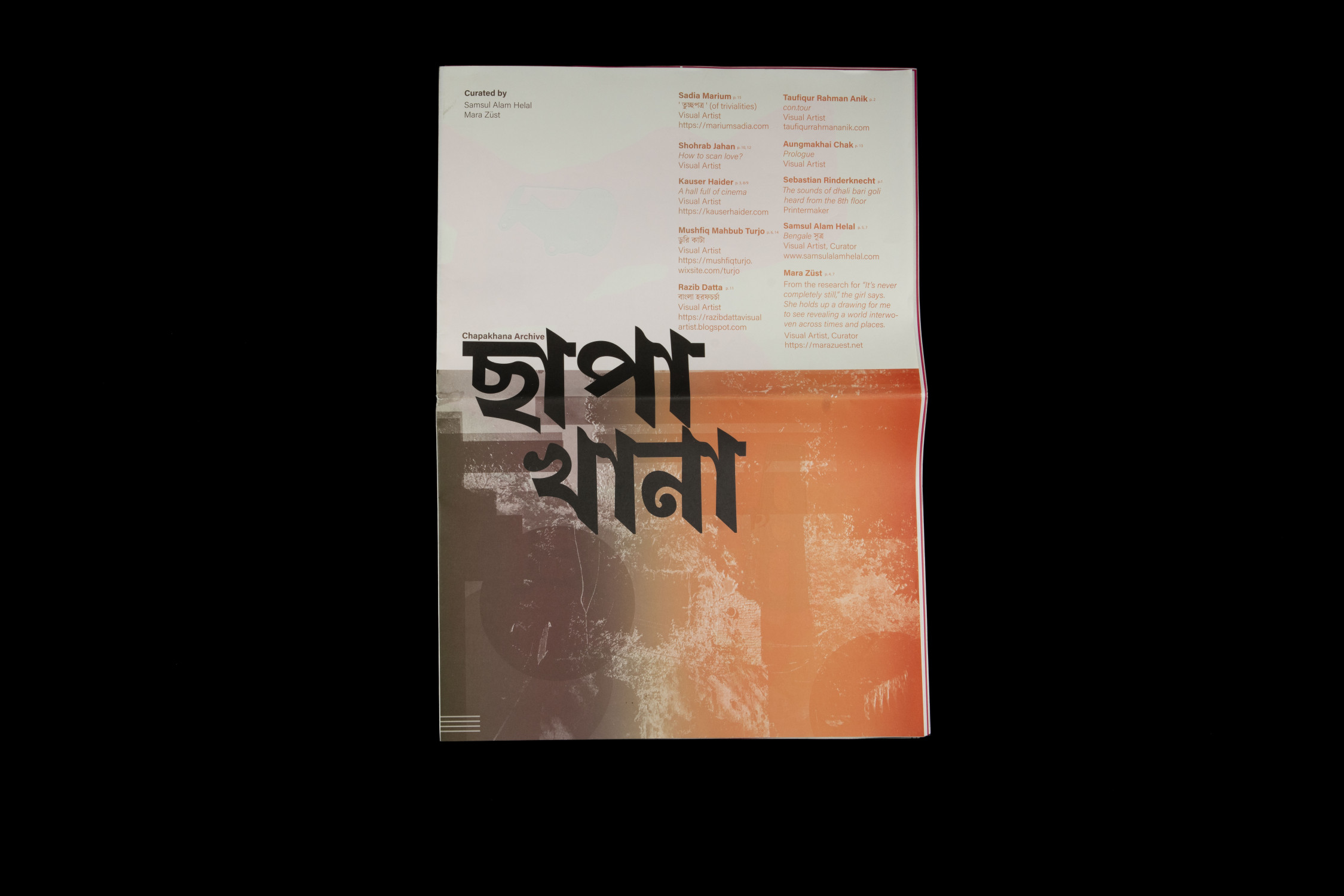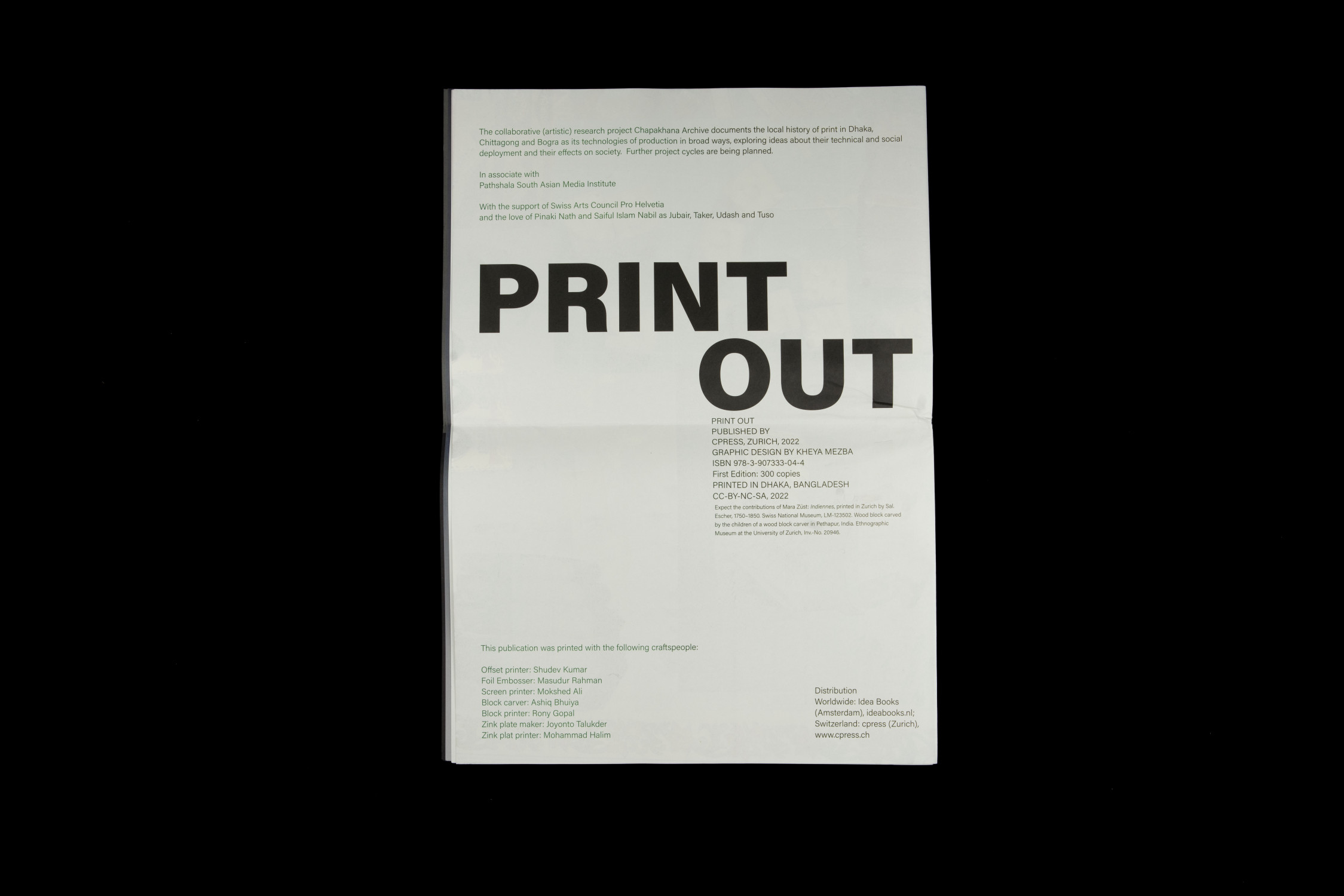 24pp; Newsprint; 350×500mm; First edition; 300 copies; with Taufiqur Rahman Anik, Aungmakhai Chak, Razib Datta, Kauser Haider, Samsul Alam Helal, Shohrab Jahan, Sadia Marium, Sebastian Rinderknecht, Mushfiq Mahbub Turjo and Mara Züst; graphic design by Kheya Mezba; printed by Mokshed Ali (Screen printer), Ashiq Bhuiya (Block carver), Rony Gopal (Block printer), Mohammad Halim (Zinc plate printer), Shudev Kumar (Offset printer), Masudur Rahman (Foil embosser), Joyonto Talukder (Zinc platemaker); Published by cpress, Zurich; Distributed by Idea Books, Amsterdam; ISBN 978-3-907333-04-4; 2022